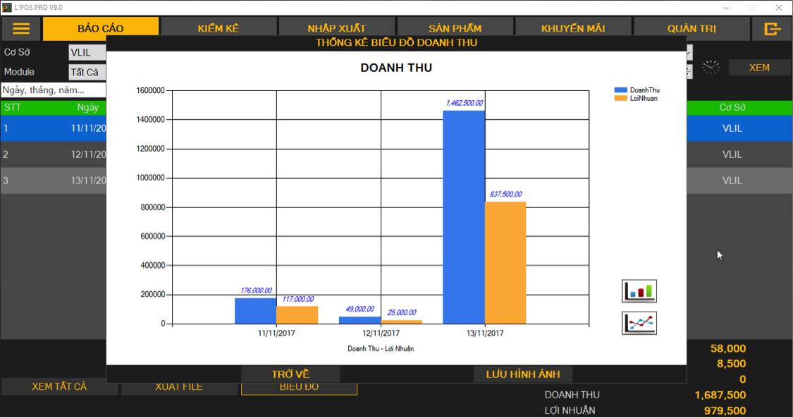 Nhà quản lý còn có thể xuất ra File Excel phục vụ cho các mục đích khác hoặc Xem biểu đồ tăng giảm Doanh thu ngay tại phần mềm.