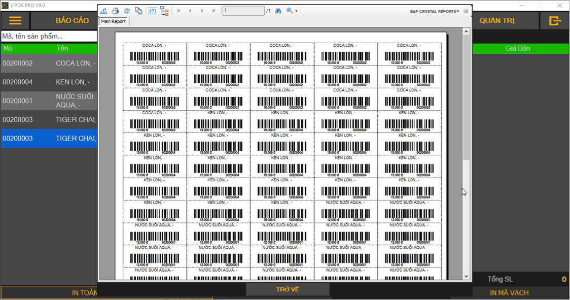 Phần mềm Quản lý Nhà hàng, Cafe - TimePOS hỗ trợ in tại một thời điểm toàn bộ mã vạch sản phẩm hoặc có thể in chính xác theo số lượng từng đợt nhập hàng.