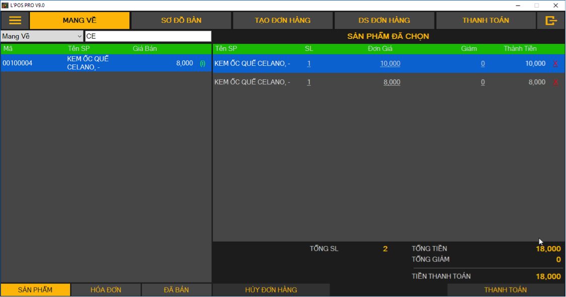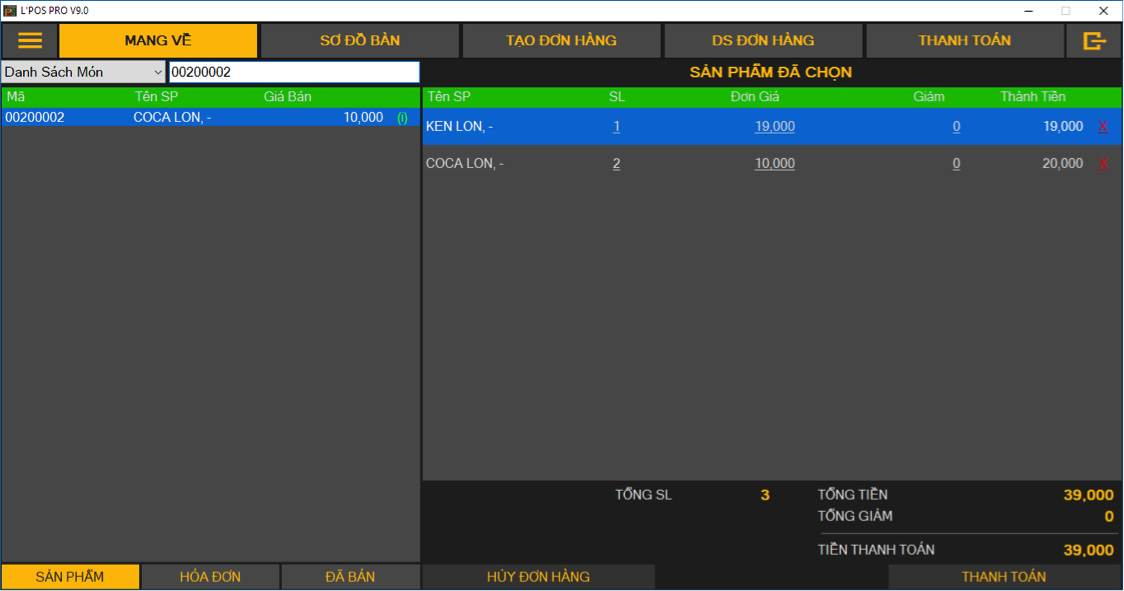 • Mang về: Hay còn được gọi phổ biết là Take-away, thanh toán in hóa đơn trực tiếp ngay sau khi order.